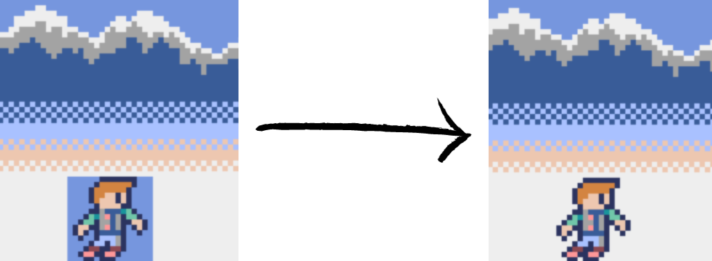 Comme le montre l’image ci-dessous, il faut aussi ajouter un dernier paramètre à la fonction blt pour que la couleur 12 (bleu) soit transparente également pour le personnage (dons dans la méthode draw de la classe Personnage).