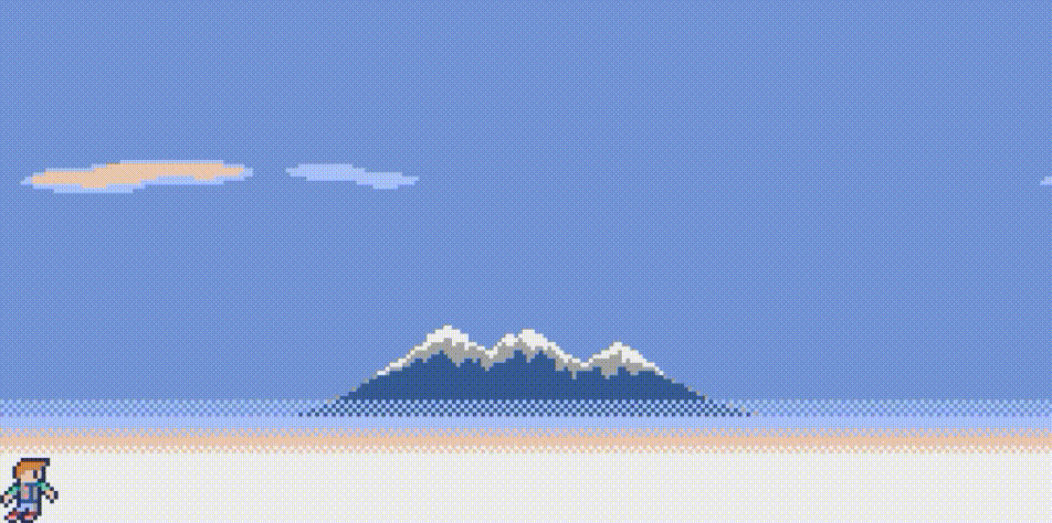 - Montagne : le coin supérieur gauche a pour coordonnées 0 et 64, l’image a une largeur de 160 pixels et une hauteur de 24 pixels.